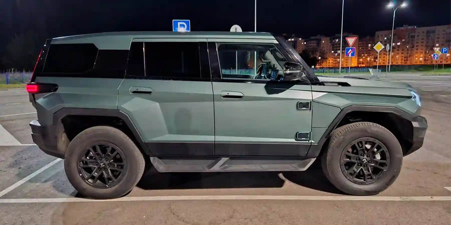 На тест нам достался самый интересный цвет под названием Khaki (темно-зеленый). Есть еще черный Blackout и серый Titan. Машина в любом случае будет матовой, что только подчеркивает рубленые грани и сложные формы кузова. Можно выбрать один из нескольких вариантов резины и колесных дисков, также доступен набор фирменных аксессуаров.